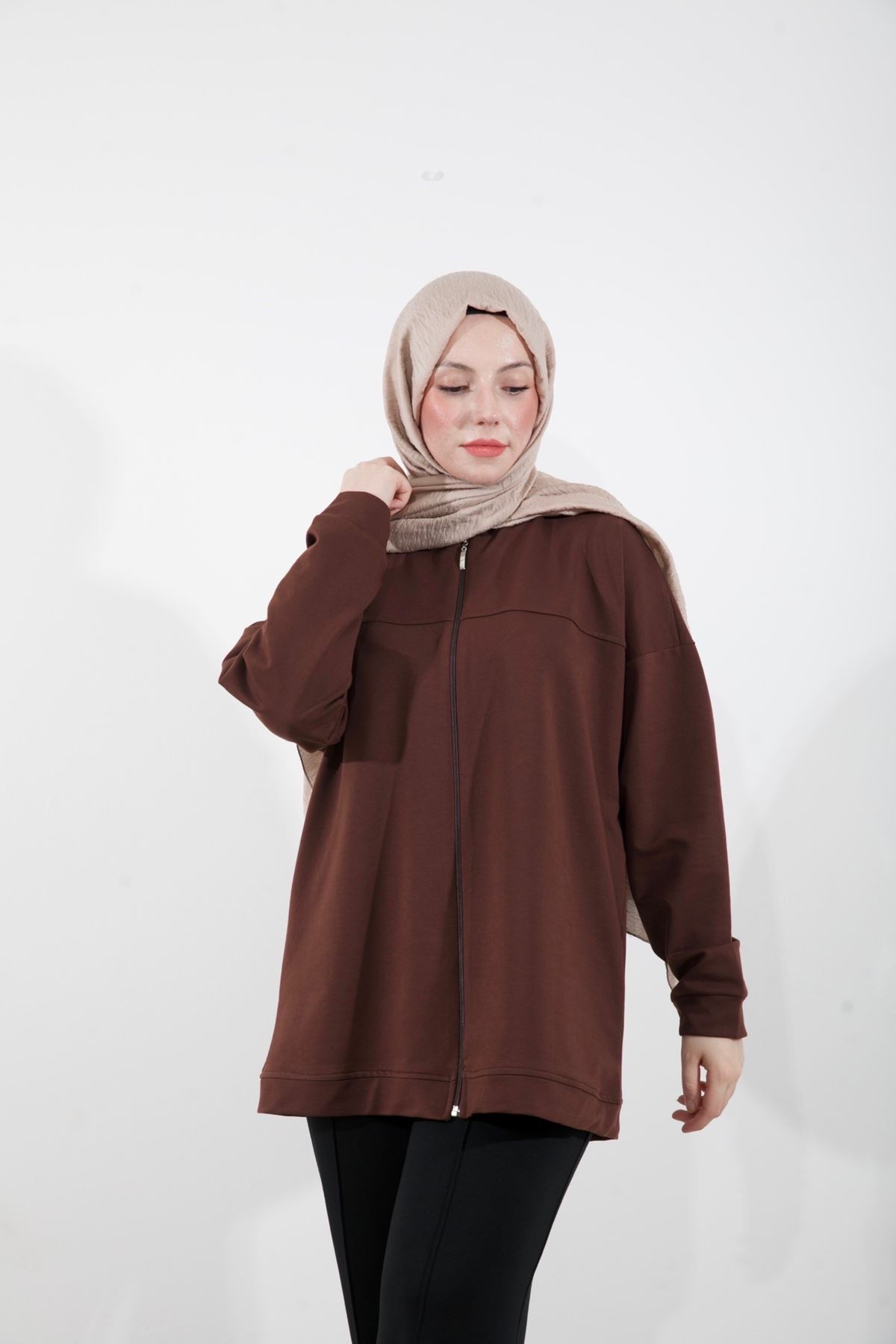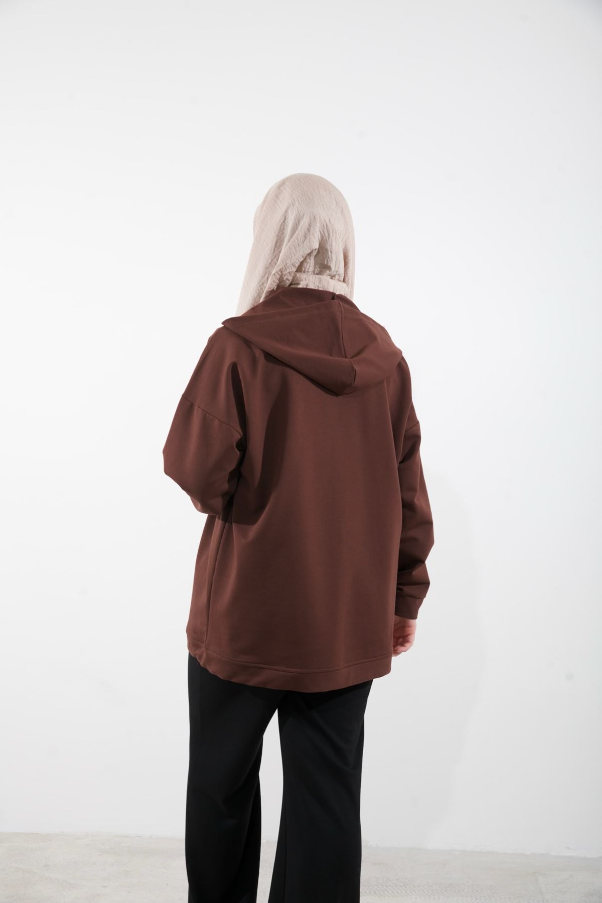Kapşonlu Fermuar Detay Hırka-Kahve