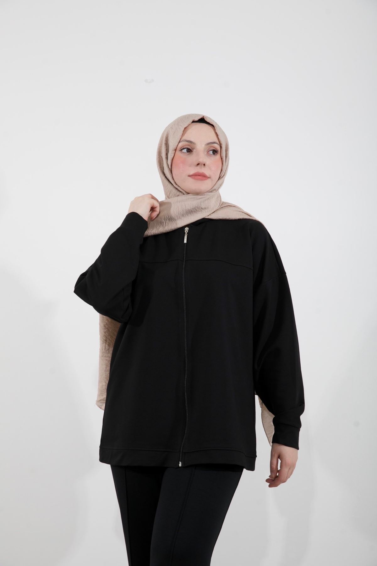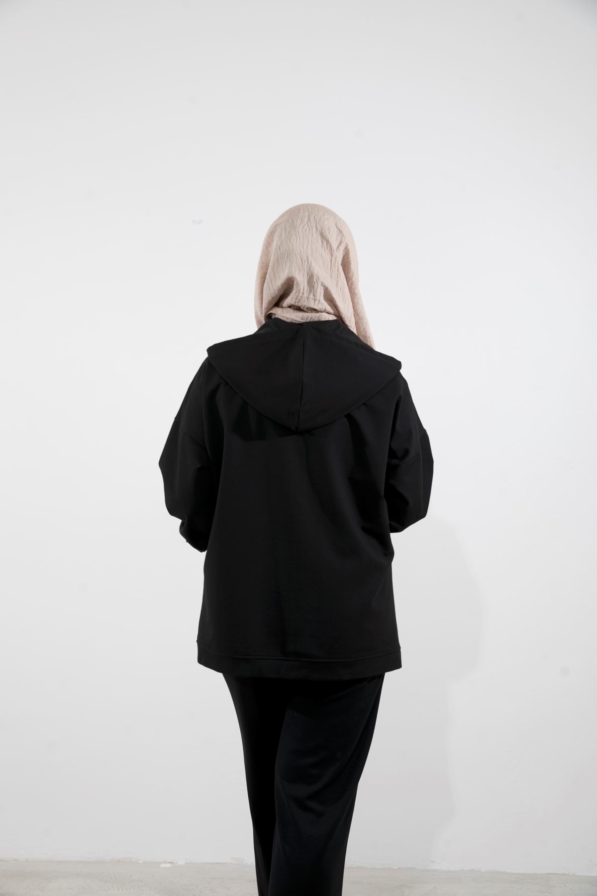 Kapşonlu Fermuar Detay Hırka-Siyah
